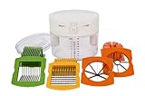 - Comes with 4 different blade combinations each made of stainless steel for slicing, wedging, coring, strip cutting & dicing