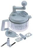 Progressive International is your source for the widest range of functional, inventive, and fun kitchen tools and great ideas put into practice. Our in-house designers spend hours in the kitchen coming up with ways to improve on a variety of traditional tasks and tools. Established in 1973, our commitment to quality and service allows us to offer a broad selection of quality kitchenware and other household products. Progressive's manual food prep machine slices and chops for easy salsa makings. This food prep machine features an egg separator, salad spinner, stainless steel chopping and blending blades attachments, non skid base, an oversize handle for leverage, and a drip free pour spout. Take apart for easy cleaning.